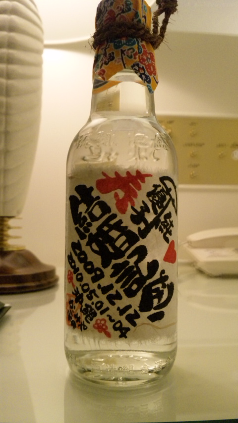 ほいで、途中、道の駅『恩納(おんな)の駅』ってトコに立ち寄り、泡盛の記念ラベルを作ってくれてんよっ。しかも、後日とかじゃなく、なy¥んやらかんやらしゃべりながら、アットホームな沖縄おじちゃんがその場で書いてラベルにしてくれましてん。それがコレ